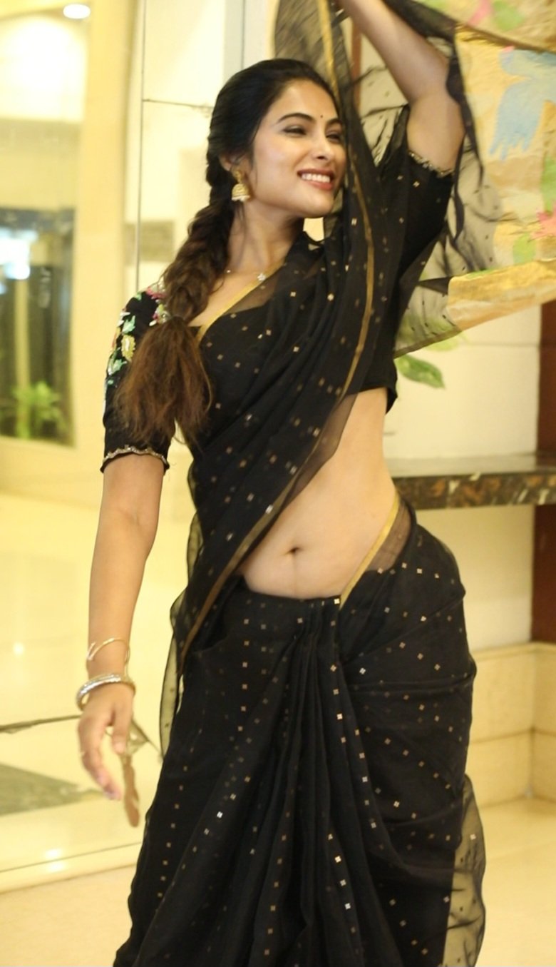ఈ క్రమంలోనే తాజాగా మరొకసారి చీరకట్టులో కనిపించి కుర్రకారుకు నిద్రలేకుండా చేస్తోంది. తాజాగా నెట్టెడ్ బ్లాక్ శా రీ ధరించిన ఈమె దానికి కాంబినేషన్లో మల్టీకలర్ థ్రెడ్ తో చాలా అందంగా డిజైన్ చేసిన బ్లాక్ కలర్ బ్లౌజ్ ధరించి.. తన అందాన్ని రెట్టింపు చేసుకుంది. ముఖ్యంగా ఈ నెట్టెడ్ బ్లాక్ శారీలో తన అందాలను ప్రదర్శిస్తూ.. నడుము, నాభి అందాలు హైలైట్ అయ్యేలా ఫోటోలకు ఫోజులిచ్చింది. అంతే కాదండోయ్ స్టైలిష్ గా కూలింగ్ గ్లాస్ పెట్టి మరి నీలాంబరి 2 అనిపించింది ఈ ముద్దుగుమ్మ.పైగా ఈ ఫోటోలను షేర్ చేస్తూ కింద క్యాప్షన్ లో.. “నా సందిట్లో ముంగిట్లో గుప్పిట్లో ఉండరా.. శృంగార వీర” అంటూ నరసింహ సినిమాలో నీలాంబరి గెటప్ లో చేసిన రమ్యకృష్ణ పాడిన పాటను క్యాప్షన్ గా జోడించి తన అందాలను ఆరబోసింది ఈ ముద్దుగుమ్మ. ప్రస్తుతం దివి వాద్య షేర్ చేసిన ఈ ఫోటోలు సోషల్ మీడియాలో వైరల్ గా మారుతున్నాయి.