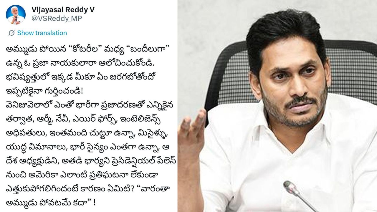 వెనిజువెలా ఉదంతాన్ని ఉదాహరణగా తీసుకుంటూ విజయసాయిరెడ్డి చేసిన వ్యాఖ్యలు ఇప్పుడు ఏపీ రాజకీయాల్లో సంచలనంగా మారాయి. వెనిజువెలా అధ్యక్షుడు పటిష్టమైన భద్రతా వలయంలో ఉన్నప్పటికీ, అంతపురంలోనే ఉన్నవారు అమ్ముడుపోవడంతో ఆయన భార్యతో సహా పట్టుబడ్డారని ఆయన ట్వీట్లో పేర్కొన్నారు. ఈ ఉదాహరణ వెనుక ఉన్న అంతర్లీన భావం ఏమిటన్నదే ఇప్పుడు ప్రధాన చర్చాంశం.
