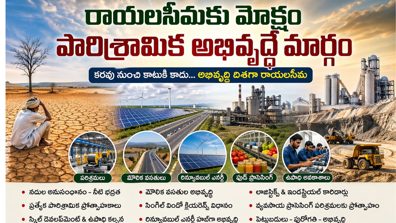 చారిత్రకంగా వెనుకబాటుతనానికి ప్రతీకగా చెప్పబడే రాయలసీమ ప్రాంతం పారిశ్రామికంగా అభివృద్ధి చేయగలిగితేనే అభివృద్ధి సాధ్యమని నిపుణులు చెబుతున్నారు. రాయలసీమలో అభివృద్ధి అవకాశాలు అపారంగా ఉన్నప్పటికీ, వాటిని సద్వినియోగం చేసుకోవడంలో పాలసీ అమలు లోపం ప్రధాన అడ్డంకిగా కనిపిస్తోంది. సరైన ప్రణాళిక, రాజకీయ సంకల్పం, పెట్టుబడుల ఆకర్షణతో ఈ ప్రాంతాన్ని పారిశ్రామికంగా శక్తివంతమైన కేంద్రంగా మార్చే అవకాశాలు స్పష్టంగా కనిపిస్తున్నాయి.సహజ వనరులు, భౌగోళిక ప్రయోజనాలు ఉన్నప్పటికీ, నీటి కొరత, పెట్టుబడుల లోపం వంటి సమస్యలు అభివృద్ధికి అడ్డంకిగా నిలుస్తున్నాయి. కేంద్ర రాష్ట్ర ప్రభుత్వాలు వెనుకబడిన రాయలసీమ పై ప్రత్యేక దృష్టి సారించాల్సిన అవసరం ఉంది. గతాన్ని పరిశీలిస్తే ఇక్కడ అనేక పరిశ్రమలు ఉండేవి.