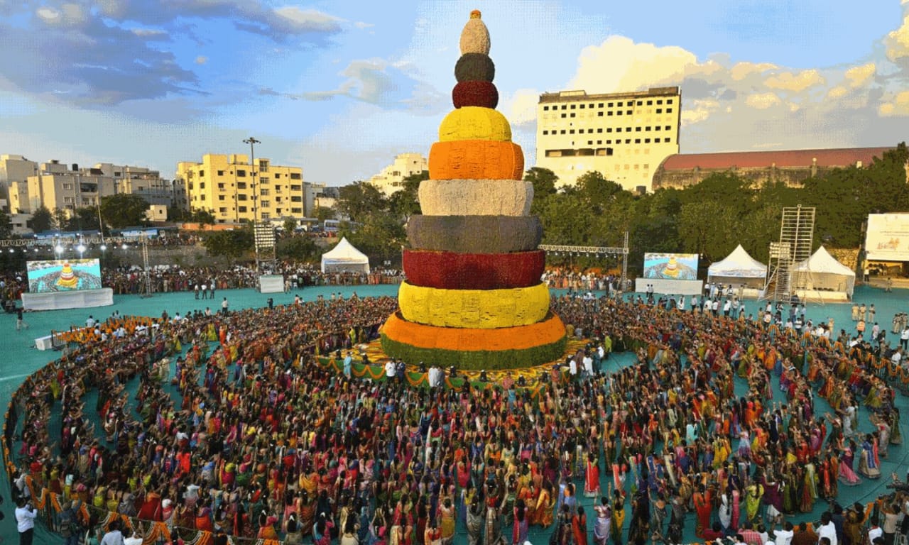 సరూర్ నగర్ స్టేడియంలో నిర్వహించిన భారీ బతుకమ్మ ఉత్సవం.. 2 గిన్నిస్ రికార్డులను సృష్టించింది. 1) 63 అడుగుల ఎత్తయిన బతుకమ్మను ఏర్చి కూర్చడంతో రికార్డు సృష్టించగా.. రెండోది ఒకేసారి 1300 మందికి పైగా మహిళలు ఈ ఉత్సవంలో పాల్గొని బతుకమ్మను పూజించి.. సంబరాలు చేసుకున్నారు. దీంతో అతి పెద్ద మహిళా ఉత్సవంగా ఇది రెండో రికార్డును సొంతం చేసుకుంది. కాగా.. నీరు-నేల-ప్రకృతికి మధ్య ఉన్న సంబంధాన్ని గుర్తు చేయడమే ఈ ఉత్సవానికి ఉన్న ప్రాధాన్యతని పలువురు పేర్కొనడం గమనార్హం.